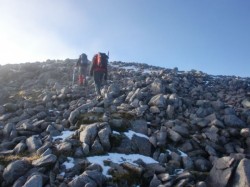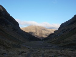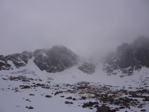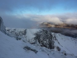As we descended the east ridge of Bidean nam Bian, however, the skies suddenly cleared, and we were treated to some very special views of the surrounding hills. A steep descent down the snowy headwall of Coire Gabhail and a long walk out through the Lost Valley, past the spectacular erratics which mark the entrance to the valley, completed the day.