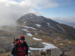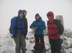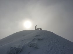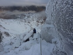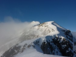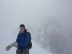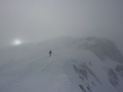 The rest of the climb was an easy romp to the top, made slightly more interesting by the need to bang my right crampon with my axe to knock the snow from it every few steps. Luckily, another party came up the gully after us, found it and brought it up for me. I couldn’t re-fit it on the hill as the metal clasp was bent (and no amount of prying with an axe would budge it), but it was much appreciated all the same.