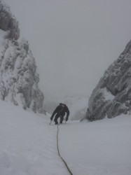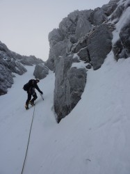 We set off in the dark, sure that lots of people would also be heading to one of the few crags in winter nick, and were first into the corrie. Unfortunately, the mist prevented us from starting climbing straight away as we struggled to identify which buttress was which. After spending some time enjoying a ‘second breakfast’, our wait was rewarded when the murk cleared slightly. Boomerang Gully looked in good condition, so we started up it. It was still very quiet by this stage and hardly any climbers had arrived in the corrie. Maybe everyone had headed to the Ben or the Norries instead?