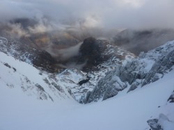 Boomerang Gully is a straightforward snow climb, with just one steep icy pitch to liven things up and make you feel the want of a rope. Halfway up this pitch I looked down to see a small yellow bit of plastic fall from my crampon and disappear southwards – my anti-balling plate!