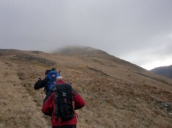 Sunday brought clag, drizzle, wind and a dusting of snow higher up. After much impassioned debate on the subject the previous evening (particularly on the part of the two aspirant munroists present) it was eventually decided that Beinn a’ Chuallaich, a Corbett, would be the best choice, on the basis that lower hills would be relatively clag-free. (This may have indicated a certain degree of optimism.) The idea of a short day also appealed to the aching legs which followed the previous day’s exertions.