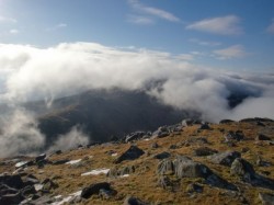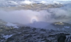 A gentle mist weaved around the upper parts of the mountain, but after some friendly waves from the local Brocken Spectres, the mist conveniently broke up just where the going becomes a bit complicated. The cold grey blanket returned near the summit, however. "Thirty-one" said Frank.