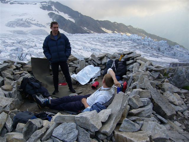 wasn't going to give in now. My first challenge was the snowbridge over the bergshsrund which was completly rotten. I threw myself over this to be rewarded with an extremelty loose gulley filled with rock and ice rubble. Over the course of the next hour I advanced about 30m. Seeing the sun hit the top of the col I decided it was time to come down. This was gutting as it was my first real alpine route of the holiday. It was ten minutes later plodding back down the glacier when we heard the sound, a small rock fall. This grew in intensity until tonnes of rock and ice were pouring down the couloir in which we had until recently been .... There is honour in victory, honour in defeat ....and honour in just staying alive... |