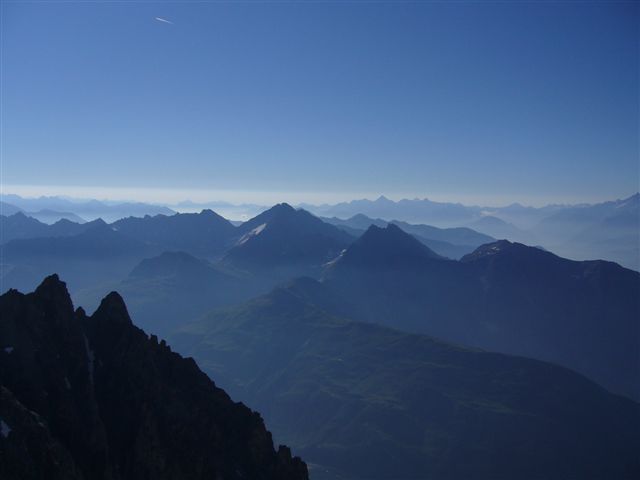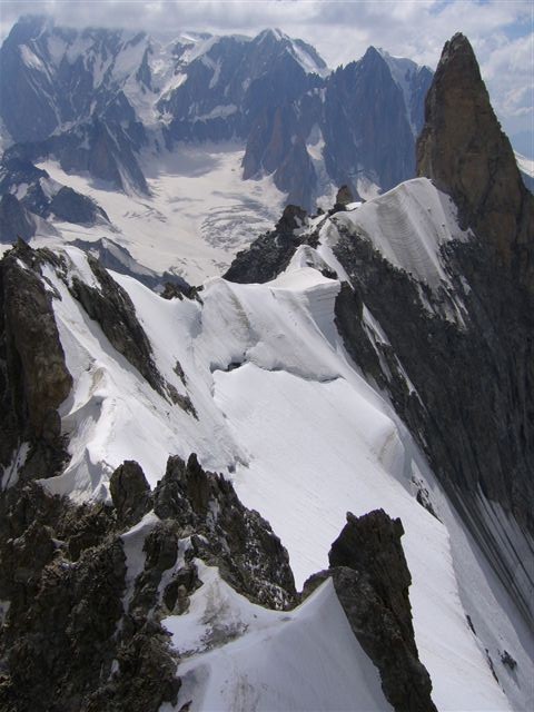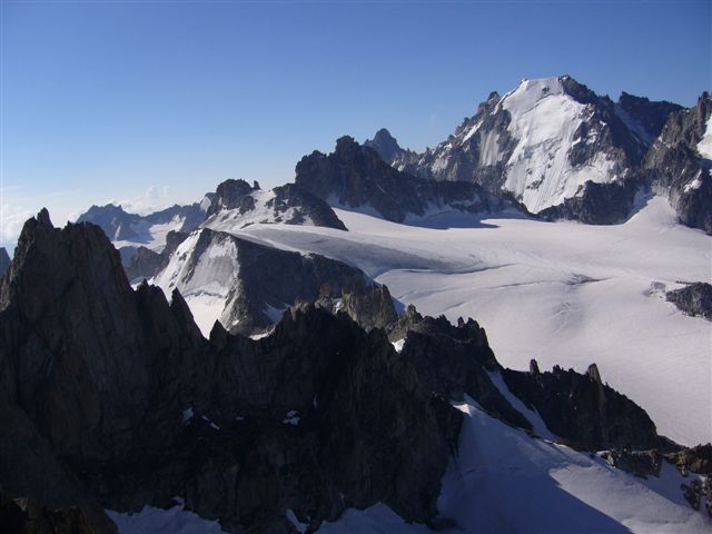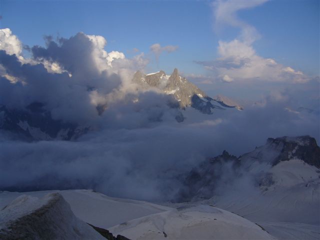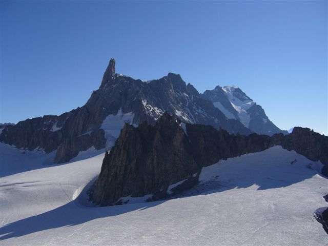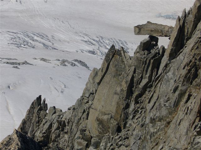 it wouldn't increse the hazard of avalaunch or stonefall. the route was amazing, not quite as good as the Midi-Plan traverse which I had done some years previoulsy but excellent all the same. we had decided not to do the Grandes Jorasses on this trip after our late start and investigation into the technical difficulties. In terms of time it was not realy feasible to get to the Canzio Bivouac in time. |