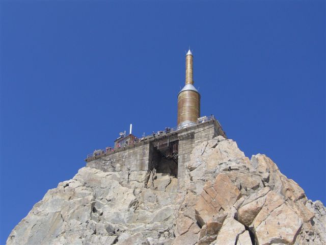 hours to get our uplift! This did however have two benefits. We completed Cosmiques ridge only seeing one party coming down. This routes finished somewhat spectaculary on the Mont Blanc viewing platform via a ladder and unusually no click of a Japenese camera! Secondly this forced us to Bivi at the Midi Station as the last car to Italy had already left. You are permitted to Bivi in the corridor next to the plant room which is warm although a little noisey! The Midi really does make a 5* bivi spot being warm, having toilettes and access to the afiorementioned viewing platform. |