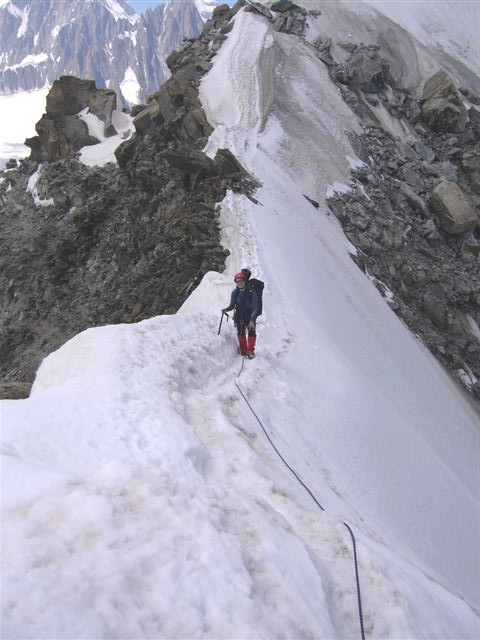 noted in the guide. The route was a techical ridge which at times was knife edge. For the most part I led and we moved together. Just below the table the climbing became very technical so we pitched it. The move onto the table was not difficult but if you can imagine gear at your feet and immense exposure then you may be getting close. We devised a way to protect the move by throwing a rope over the table!! In alpine climbing it is not being technically competant that is often required. It is being able to move together confidently on the easier terrain and then being able to use a little creativity and inititive now and then! |