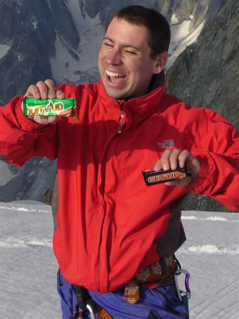 reverse the arete and use our wisely bought return tickets. We reached the end of the arete at 10pm. The downclimbing through the rock acent took 5hrs (instead of 2 on the ascent). At 3.30am we reached Helbronner to hit the deck only to be awoken by tourists walking all over us at 8am! What an adventure! |