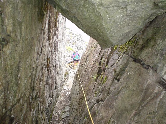 crest, drop down to the right, squirm into the gap and climb out using
