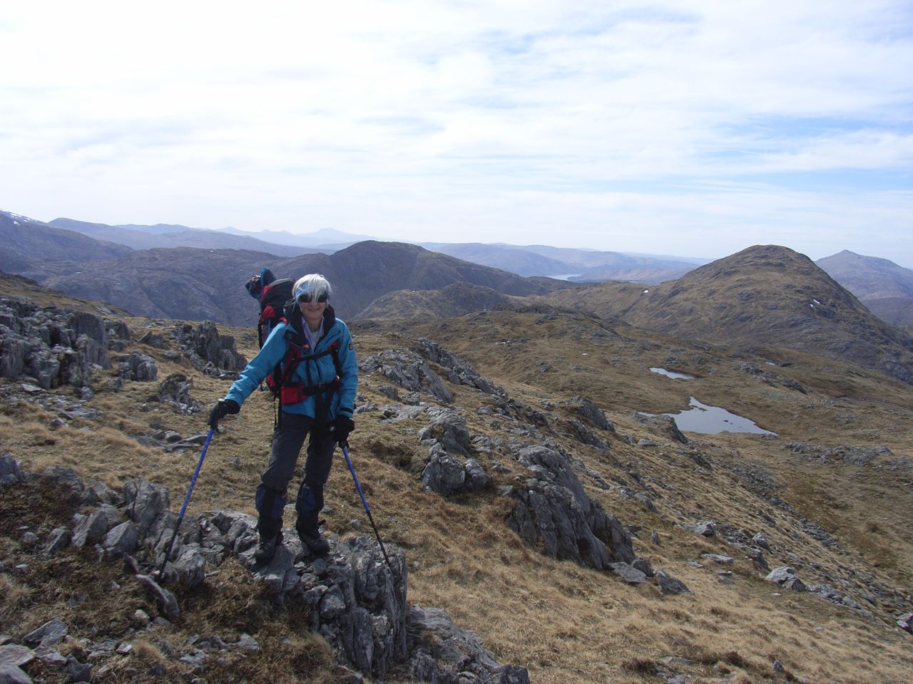 Day 2 began with a steady pull up a reasonably-angled hillside onto the next ridge, overlooking the Cona Glen. Turning west, the crest rises from 500 metres to 720 metres. Although fairly broad, it is an intricate mass of rock outcrops and boulders. A nightmare in poor visibility, we guessed. Up and down, some old fence posts were a useful guide over various knobbly bits, and finally an extremely steep drop to a big bealach.