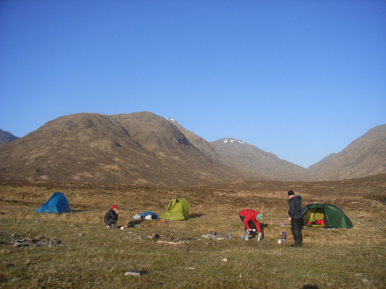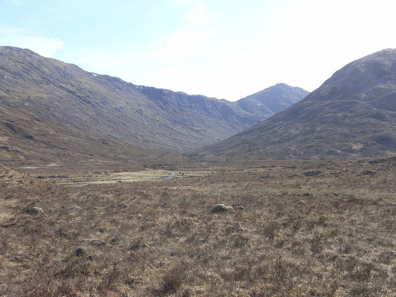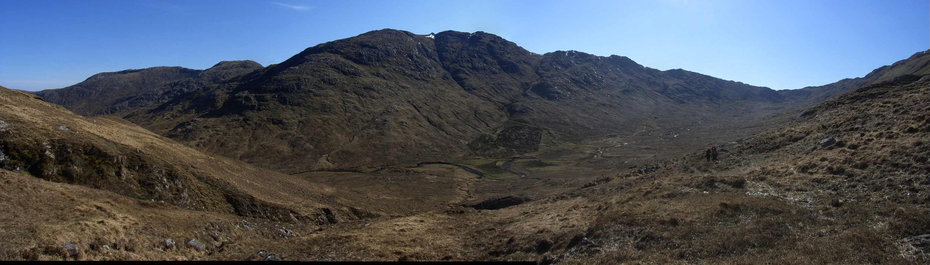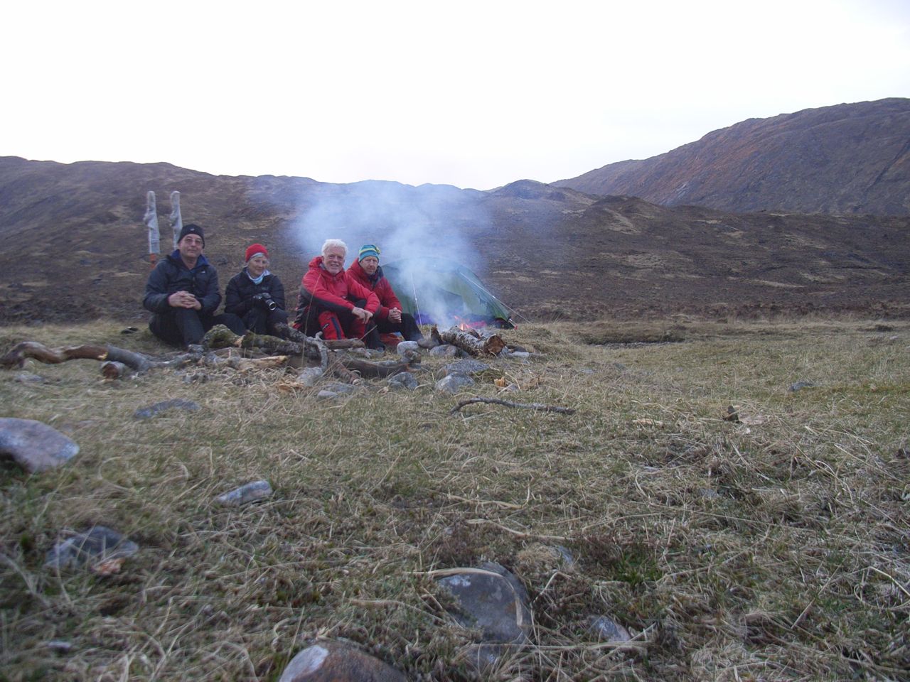 The face which rises abruptly from practically sea level, offers no obvious best route; so we settled on the line of a yellow gulley in the centre. After 300 metres of very steep ground, we got a brief respite, before having to snake about to get round an upper crag, and finally access to more straightforward ground, then finally the 762-metre summit by about 2pm. From there, the north ridge was located which took us down into the next valley (the River Scaddle) and an excellent camping site between the junction of two streams. Our 18Km + 785 metres justified a good meal, camp fire, and some Water of Life.