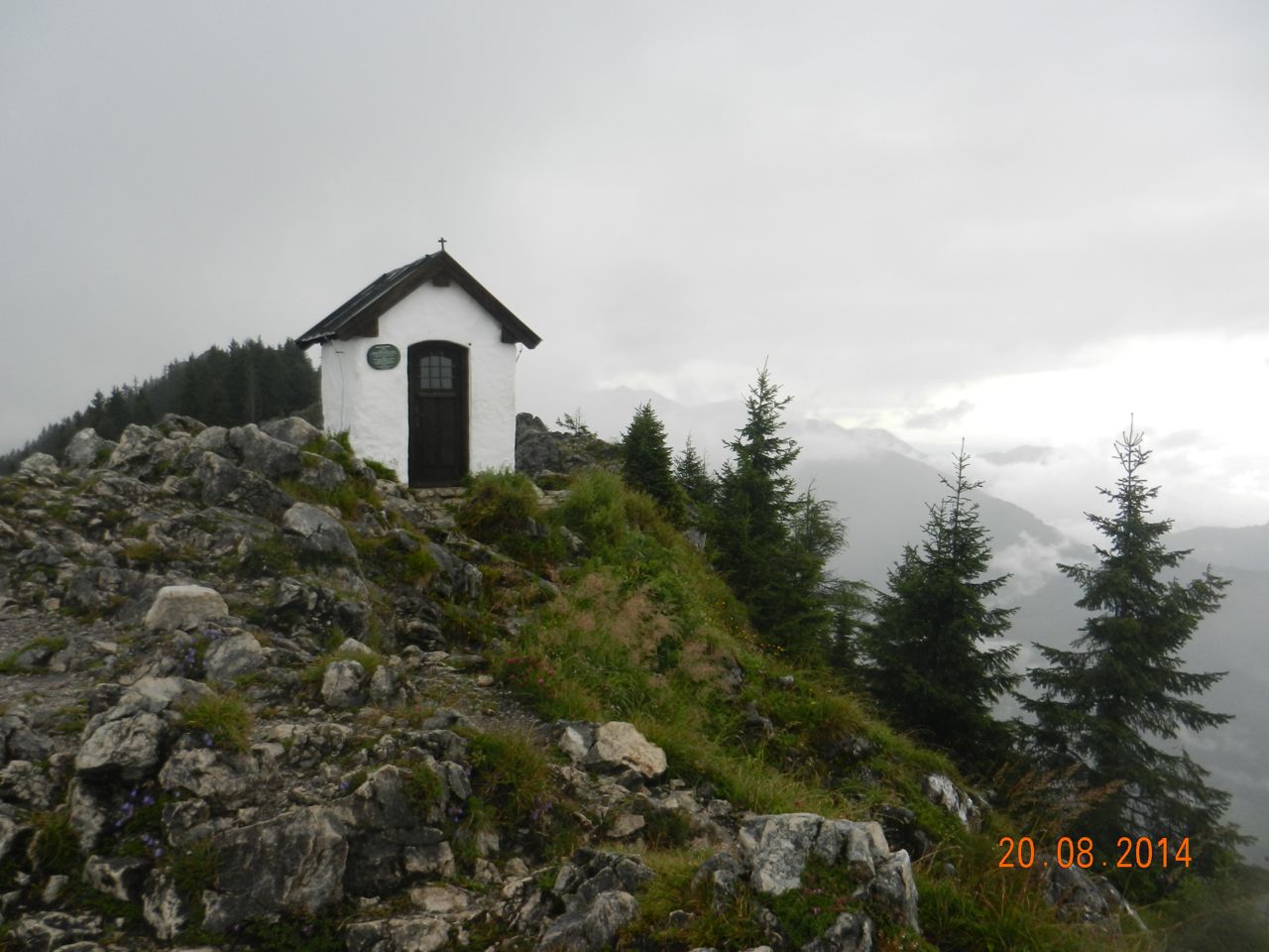 Sadly, this was to be our only mountain hut of the tour. It's a very nice hut indeed, and we ended up round a table talking to the "stammtisch' (regulars) who are a set of cow-herds living seasonally on the mountain. Behind the hut, the Brunnstein is a modest but pleasant hill, which has a short 100 metre protected path through crags to a small summit, which includes a tiny chapel maintained by the local Mountaineering Club.