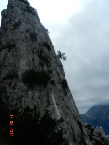 Eventually, about 130 metres above the start, it arrives at a detached pinnacle of rock.