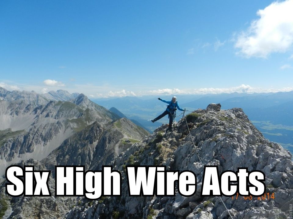 Starting from the Hafelekar station above Innsbruck at 2256m, the ridge is less than 2 km long, but clambers over 7 mountain summits around the 2450 mark. It starts immediately with a stiff near-vertical climb on iron rungs, and includes many short rock steps and narrow passages, plus a short bridge.
