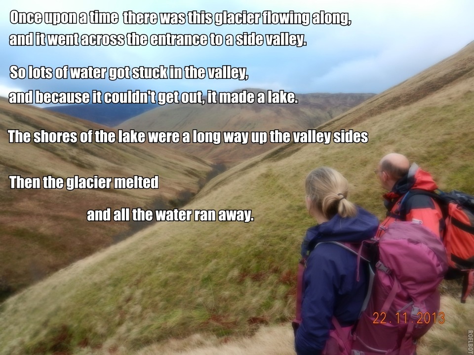 Some 12,000 years later, the weather was looking a bit cloudy. So Frank, Dave, Linda and I found our way all along Glen Roy, -- an internationally famous geological feature -- taking in the amazing horizontal lines which run for miles along the hillsides [being the ancient beaches of the former lake]. Anyone who has perused OS34 (Creag Meagaidh etc) will have seen the unusual lines called "Parallel Roads"