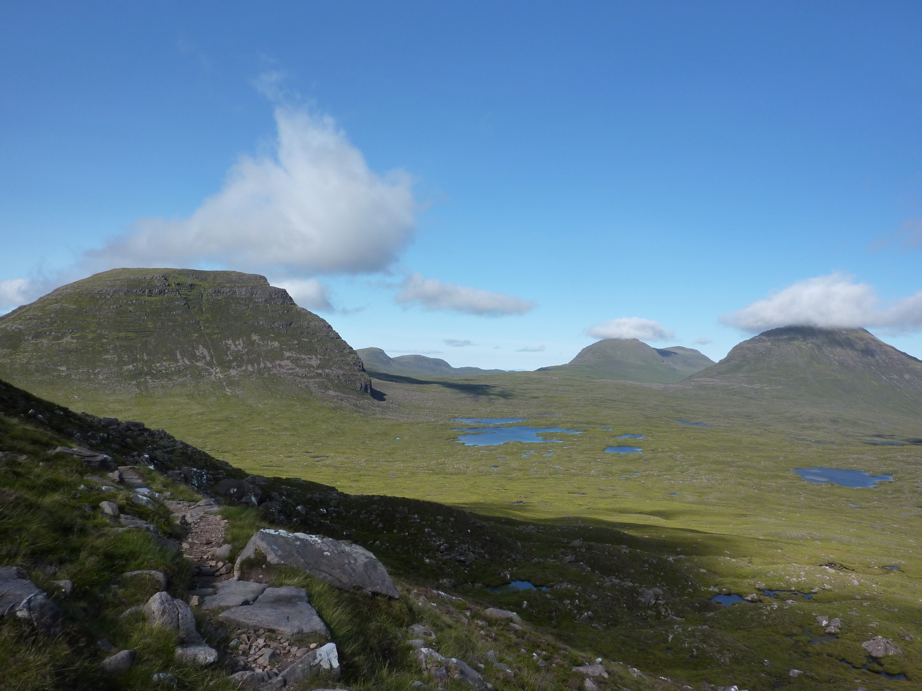 We spent the night in Shenavall Bothy before setting off across some very boggy and midge-infested terrain towards Beinn Tarsuinn. It had been forecast to clear up through the day, and we were hoping for good views from the summits, but unfortunately it stayed cloudy and drizzly all day. There was also no wind, so there were midges even on the summits of Beinn Tarsuinn, Mullach Coire Mhic Fhearchair and Sgurr Ban! As we were descending Sgurr Ban it started to rain more heavily, so we decided we couldn't be bothered with the ex-Munro Beinn a' Chlaidheimh.