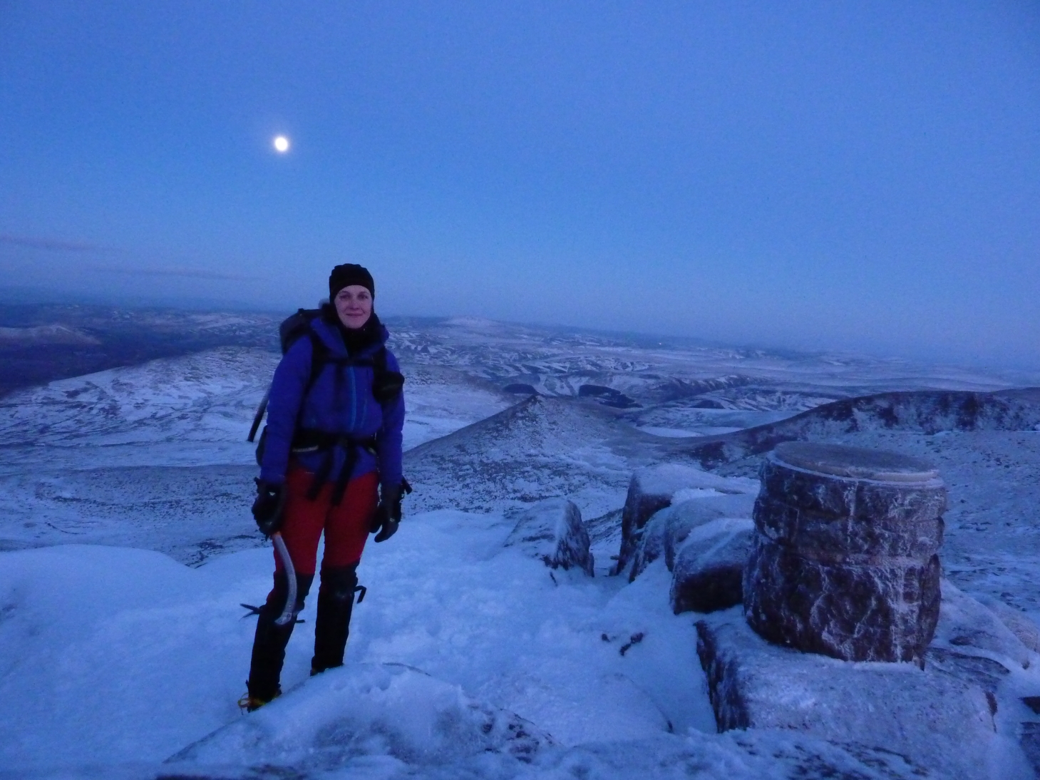 After this we put the rope away and soloed up the final 50m - 100m of easy ground leading to the plateau. Due to January's short daylight hours, and the fact we were climbing as a 3, the sun was going down by this point, but the sky was clear and the moon was nearly full, so it didn't really get dark...