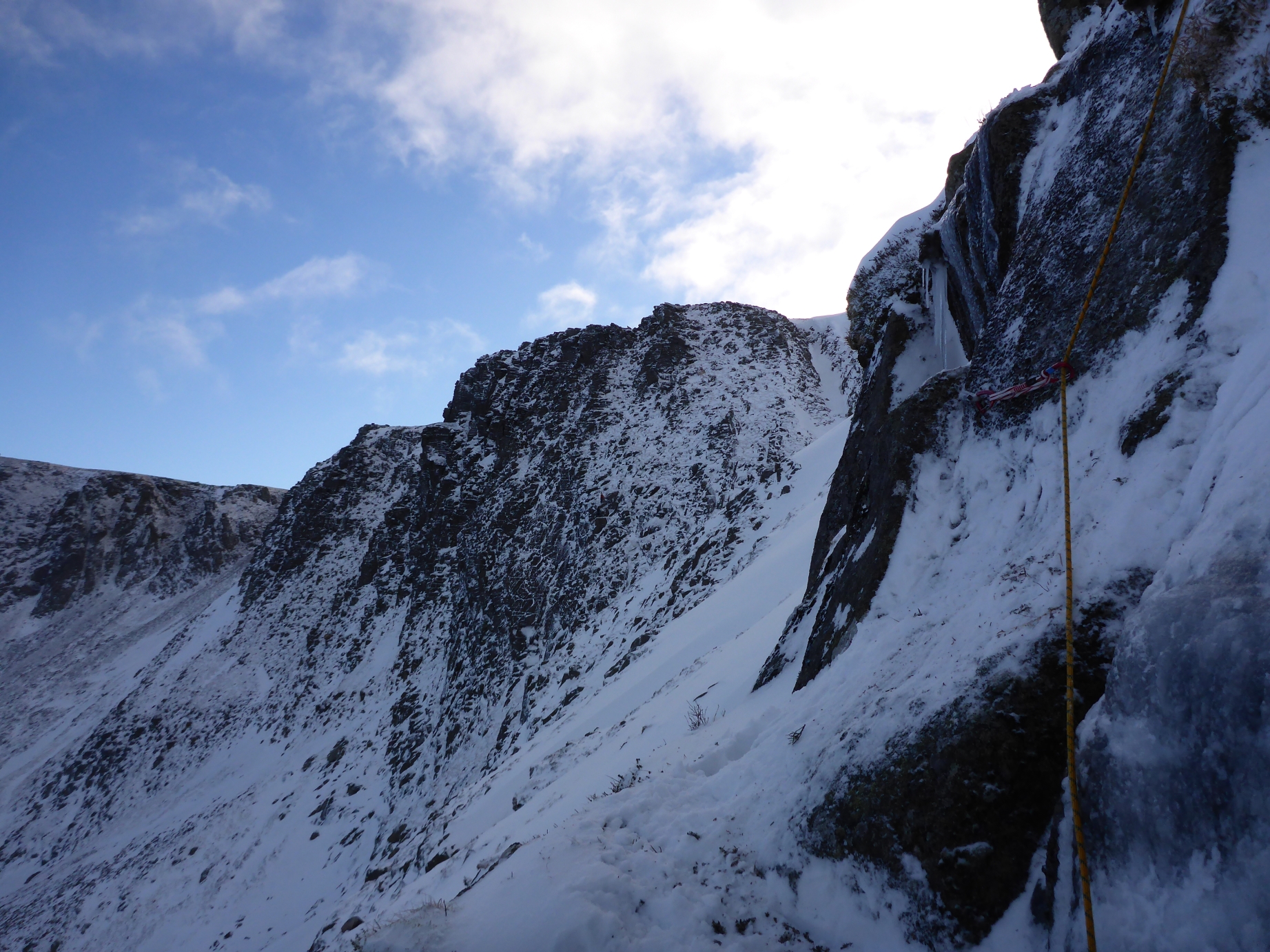 After some stormy weather over the previous few days, the weekend of 3rd/4th Jan promised 70% chance of cloud-free Munros in the SE Highlands, so Lochnagar was calling us for the first proper route of this winter. Matt, Maria and I decided on Central Buttress, a 300m grade II route in amongst the impressive cliffs of the NE coire.