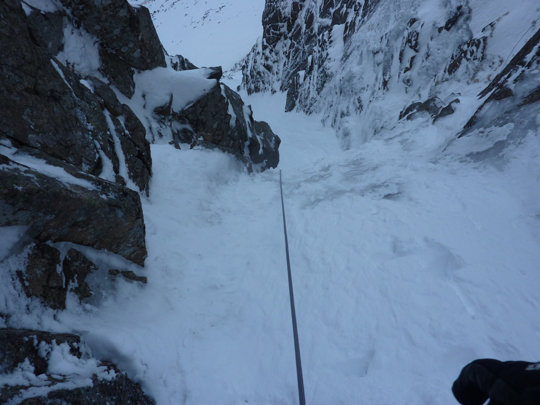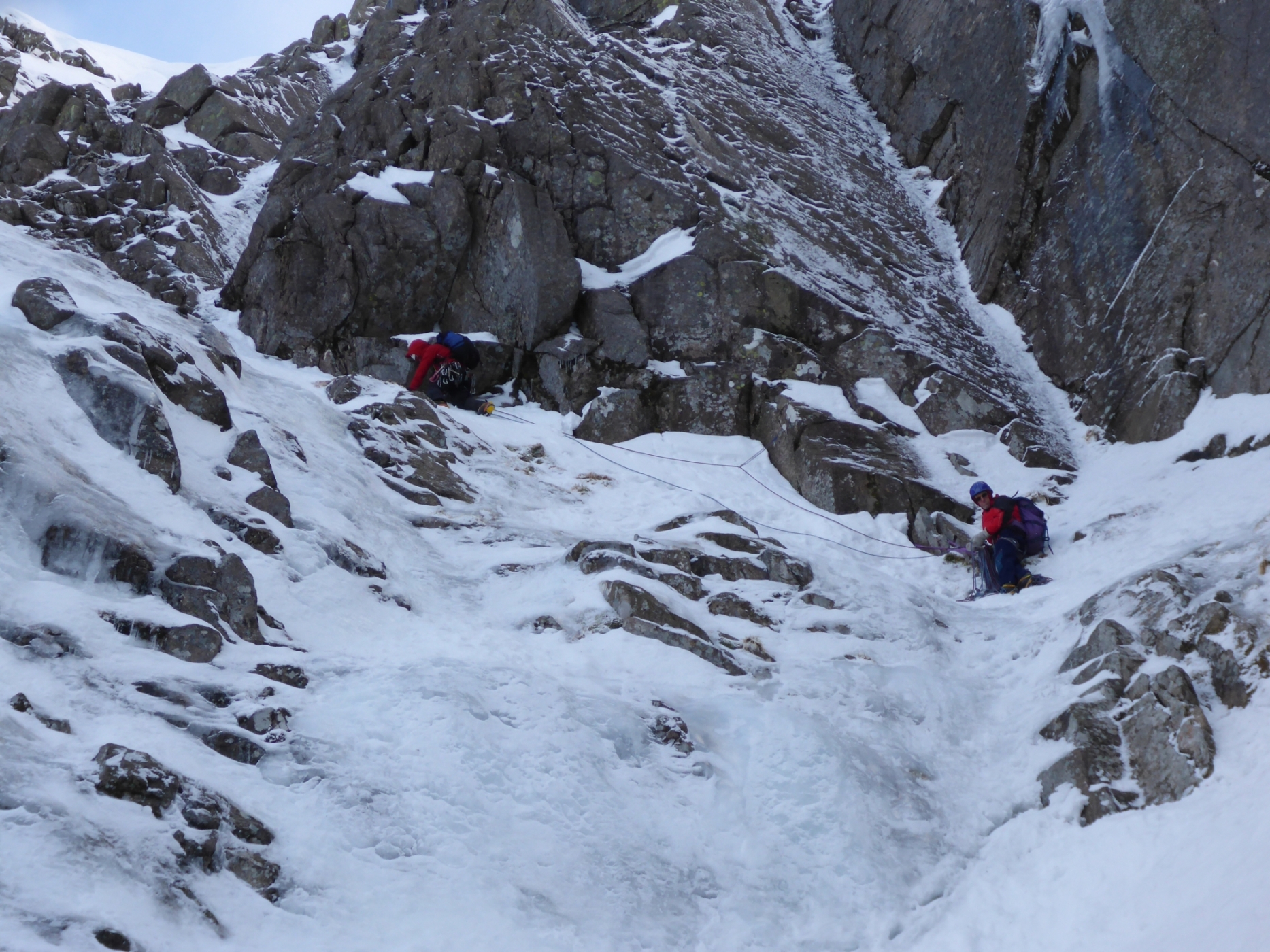Selecting Parallel Gully A, a classic 270m grade III route with an optional 60m grade IV direct finish, we headed up to the start of the route to find another pair climbing the first pitch. It was in OK condition, but at one point the ice had collapsed leaving a small gap which was a little awkward.