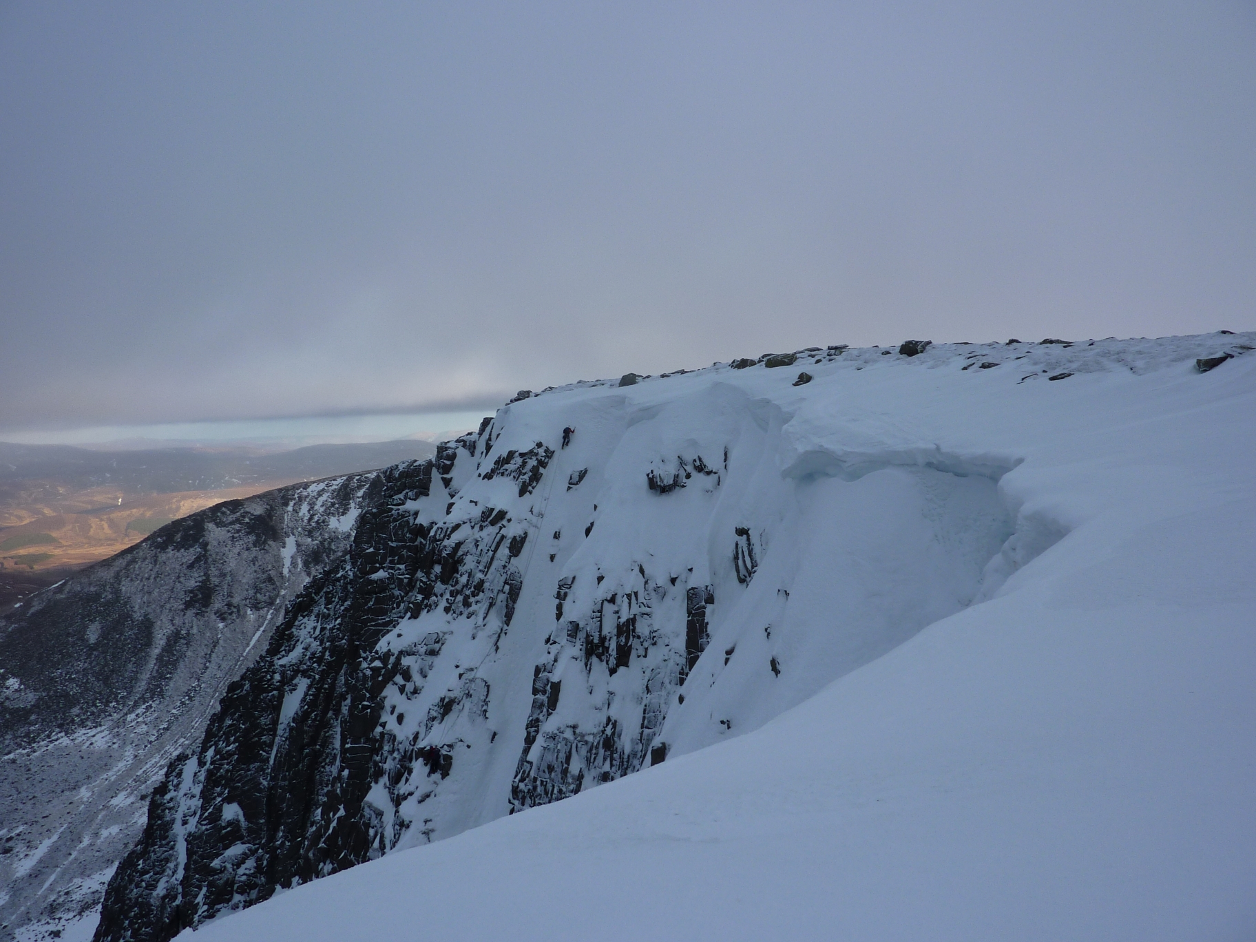 Above this, there was just one more pitch to go, but it did involve an intimidating-looking cornice. While it was pretty sugary in places, it did have a snow/ice bridge that went up and right from under the overhang, enabling a crafty traverse before a mantelshelf onto the plateau.