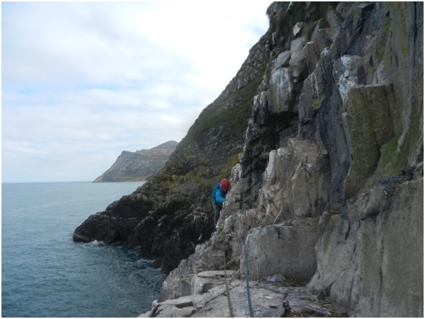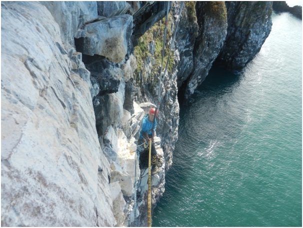 I went down first loaded with ironmongery including Ben’s old geological hammer and some pegs and tried to find the start of the route. This wasn’t obvious but could just spot the goal of a pinkish belay ledge amongst the guano. The first pitch traverses for 40m, the line wasn’t obvious but I seemed to find a logical way to the ledge with sparse gear along the way. The next pitch similarly traverses further rightwards but with some height gain including some nice exposure on an arête.