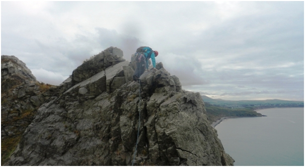 I found Ben relaxing on a massive ledge enjoying lobbing rocks into the sea and waiting for the splash. The next pitch had another alleged 4b move before disappointingly degenerating into a grassy slope. The climb seemingly over I brought Ben up and he went on up the grass slope and find himself on the wonderfully gendarme ridge atop of the quarry we abseiled from. I, in hindsight, rather foolishly expected to find ourselves back on the quarry floor whence we started rather than being on top of the quarry 100m above our sacks. This was a wonderful bonus. We went into alpine mode moving together across the narrow ridge, if one of us slipped into the quarry the other would have to jump toward the sea. A cracking finish to an exciting adventure during which we had only a lone barking seal for company.