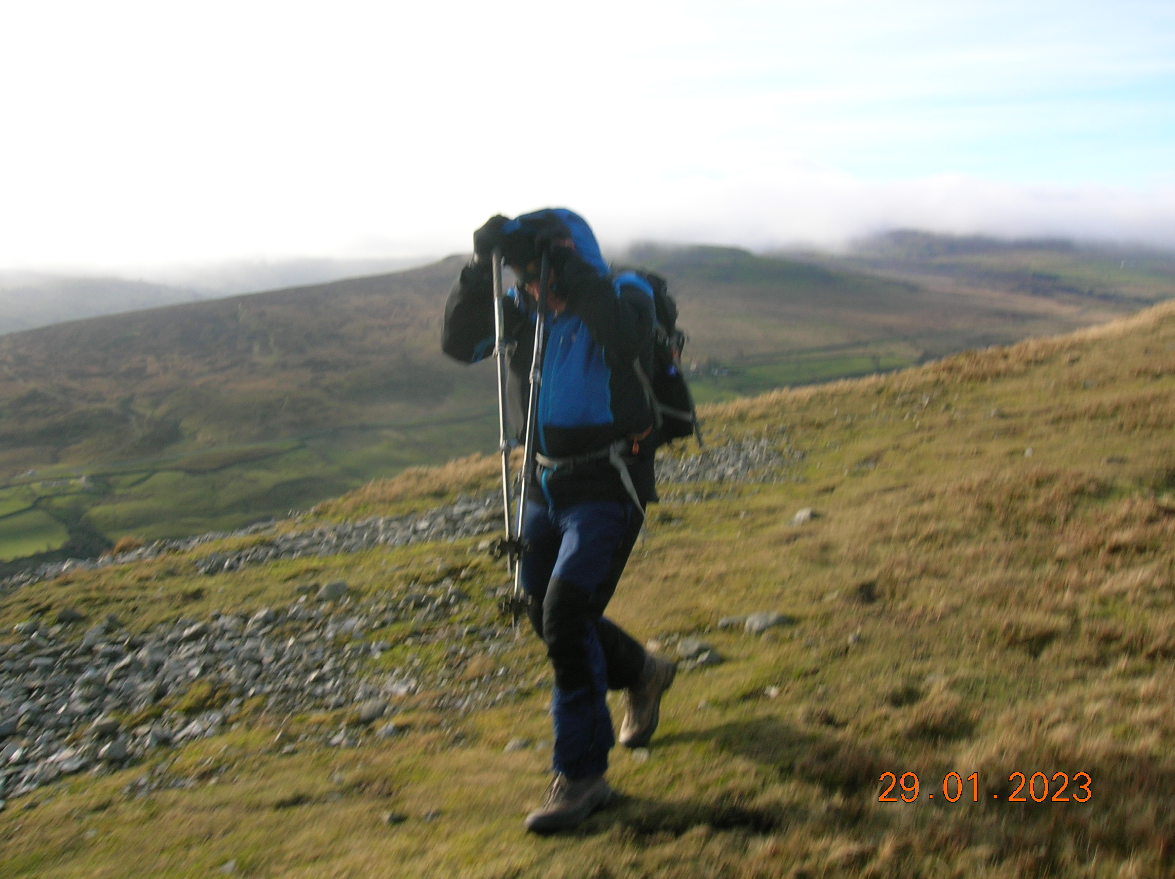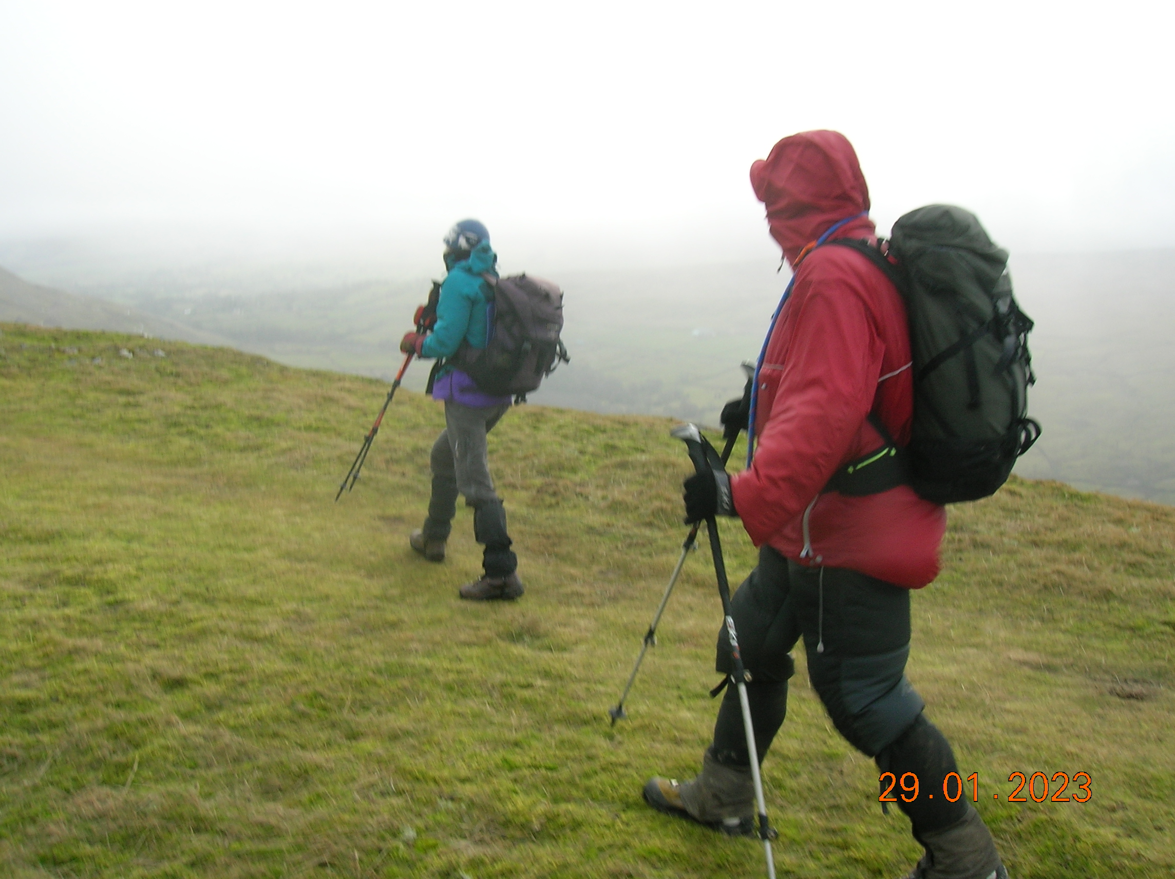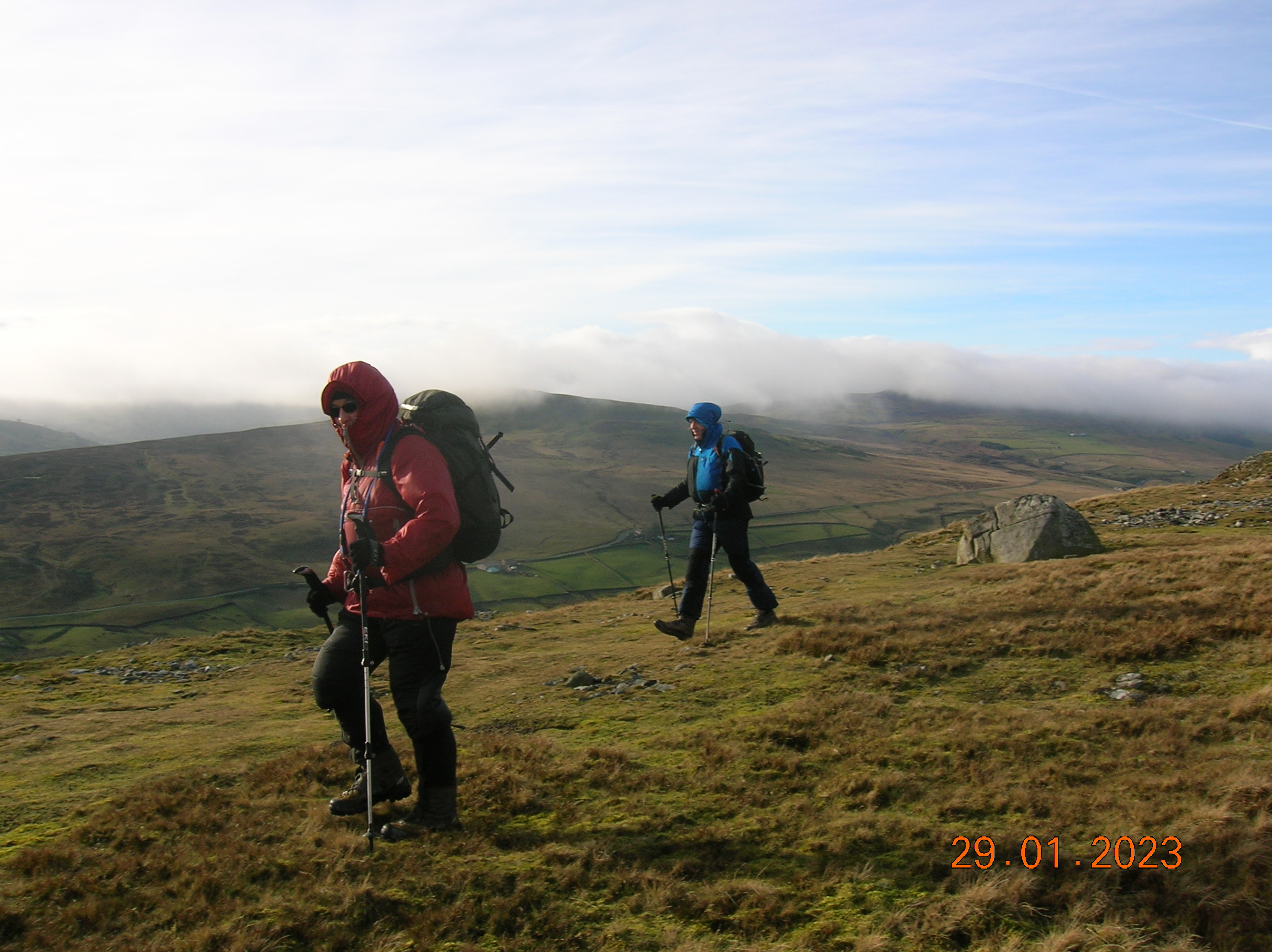 Below the cloudbase, as planned. From the cairn, there are extensive views; although the cold wind was pulling at us by now.