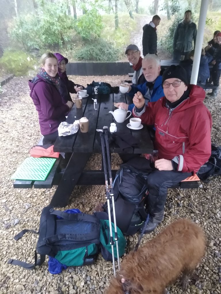 After a brief warm drink and picnic stop where left over ham and turkey sandwiches and of course a mince pie or Christmas cake and a doggy treat for Hal (and maybe some turkey!) We were once again hitting the moors as the liquid sunshine continued to pour on us. The conversations went back to reminiscing over the best way to carry an injured person of the mountains and plans were being hatched for the next great adventures as we sauntered down the valley back to Chop Gate car park. Another splendid walk with a fabulous group of people. Thanks to Steve, Andrew, Anne, Nicola, Dave and Hal for a great day out.