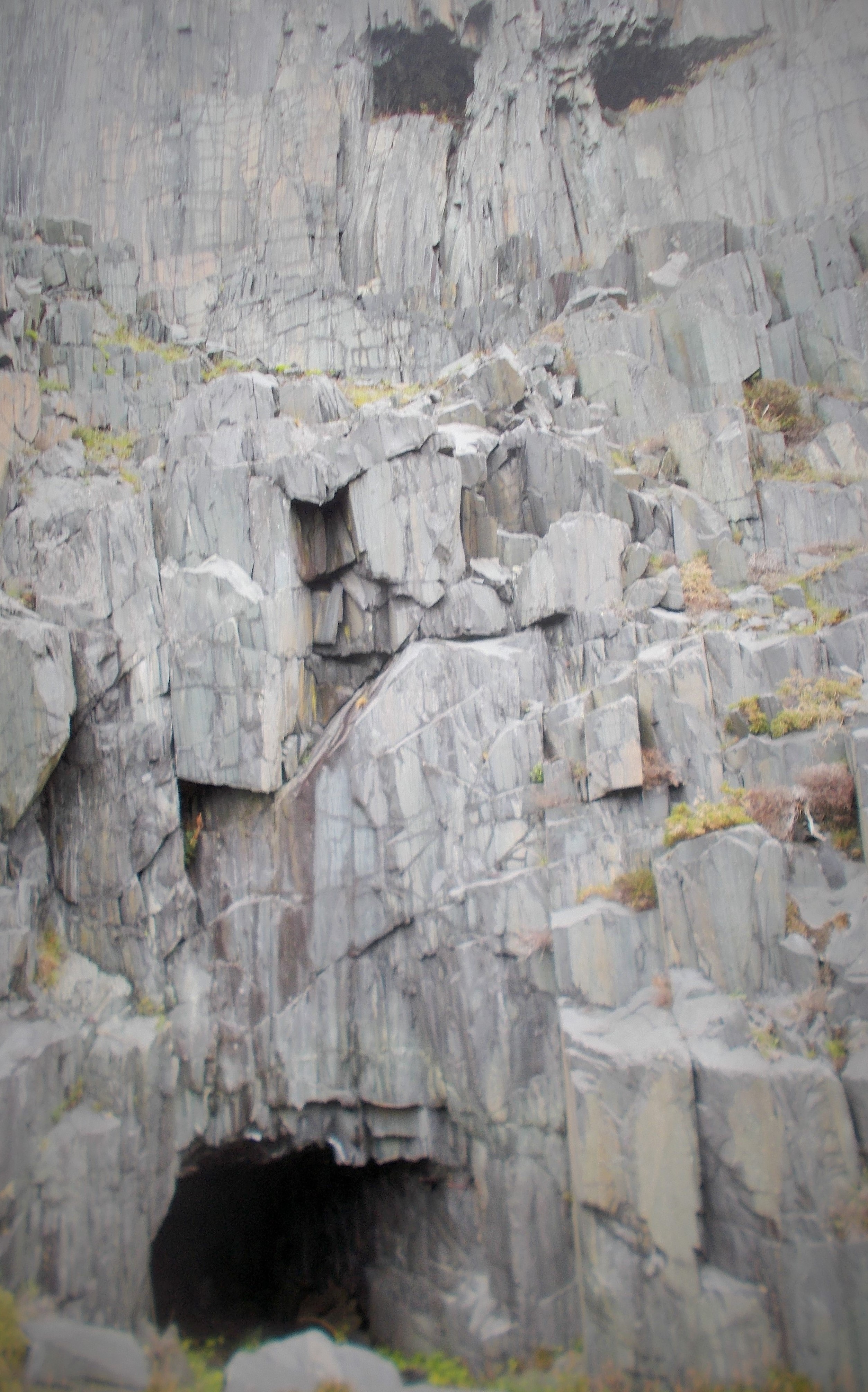After feverish anticpation Saturday morning arrived and a prompt meeting at the Bus stop parking for 9am. A short gear faff ensued just a pile of quick draws and a pair of ropes were packed. Jurgen had researched the best way into Twll Mawr and we soon found Golgotha (the place of the skull!) and entered its mouth.