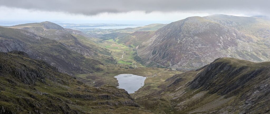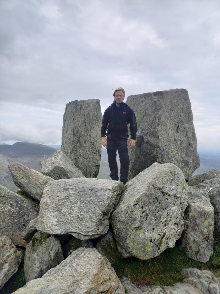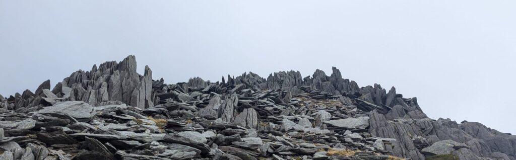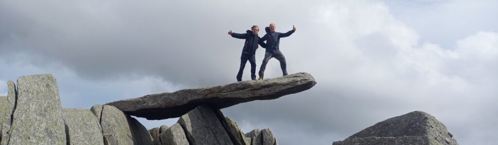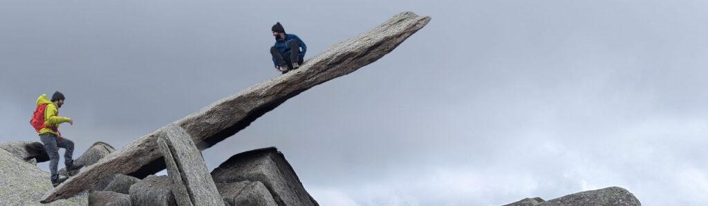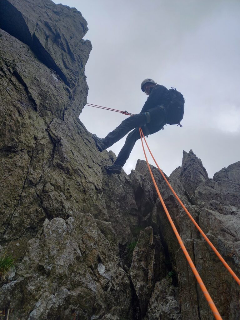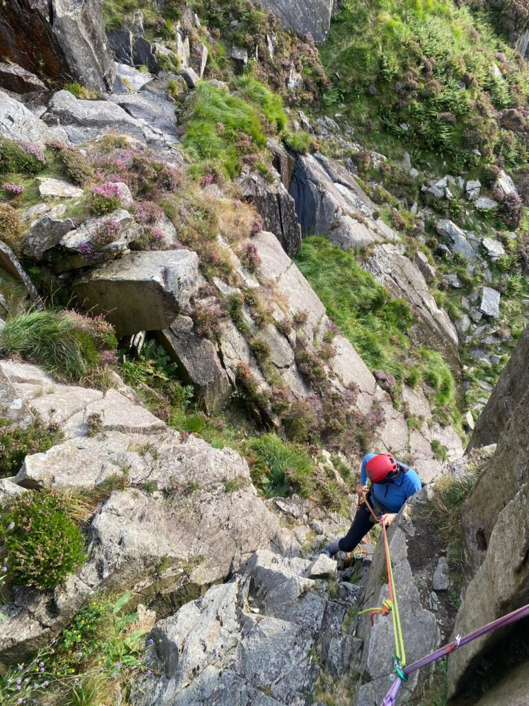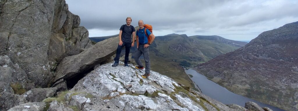 Dave and Jack set off from the hut at 9am and scrambled up the North Ridge of Tryfan then continued up Bristly Ridge to Glyder Fach. There were people about but in the late morning the routes were still relatively quiet. Near the top of Bristly Ridge, Jack enjoyed an introduction to abseiling from the very top of the First Great Pinnacle down into Pinnacle Gap. At the top of the ridge a brief detour was made to the Cantilever Stone before a traverse of the summit to descend via Y Gribin.