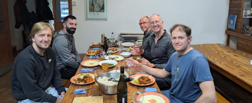 Most of us had returned to the hut in the late afternoon which gave plenty of time to relax and prepare for the evening. All hands set to work, helping Ewart to create another fantastic team meal. Emma, Jenny and Alex were slower to finish their climb on Milestone Buttress and had to eat at a second sitting. However, there was plenty of food and at least they were back in the hut before the sun had set.