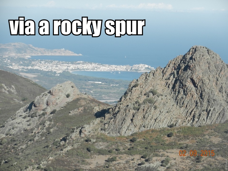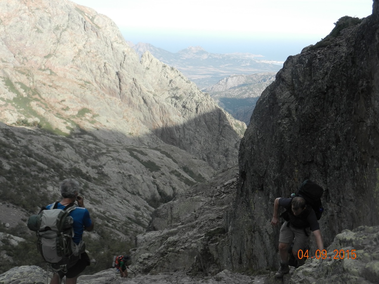 The going is almost always rocky:- steeply up and steeply down. Sometimes its walking, often using hands, and with occasional little pitches or chimneys calling briefly for proper scrambling. To make a comparison:- going up Ben Nevis via the Ledge Route scramble, and with a sac including a sleeping bag, mat, spare clothes and hill food for 5 days would give a fair approximation to the bigger days on GR20.