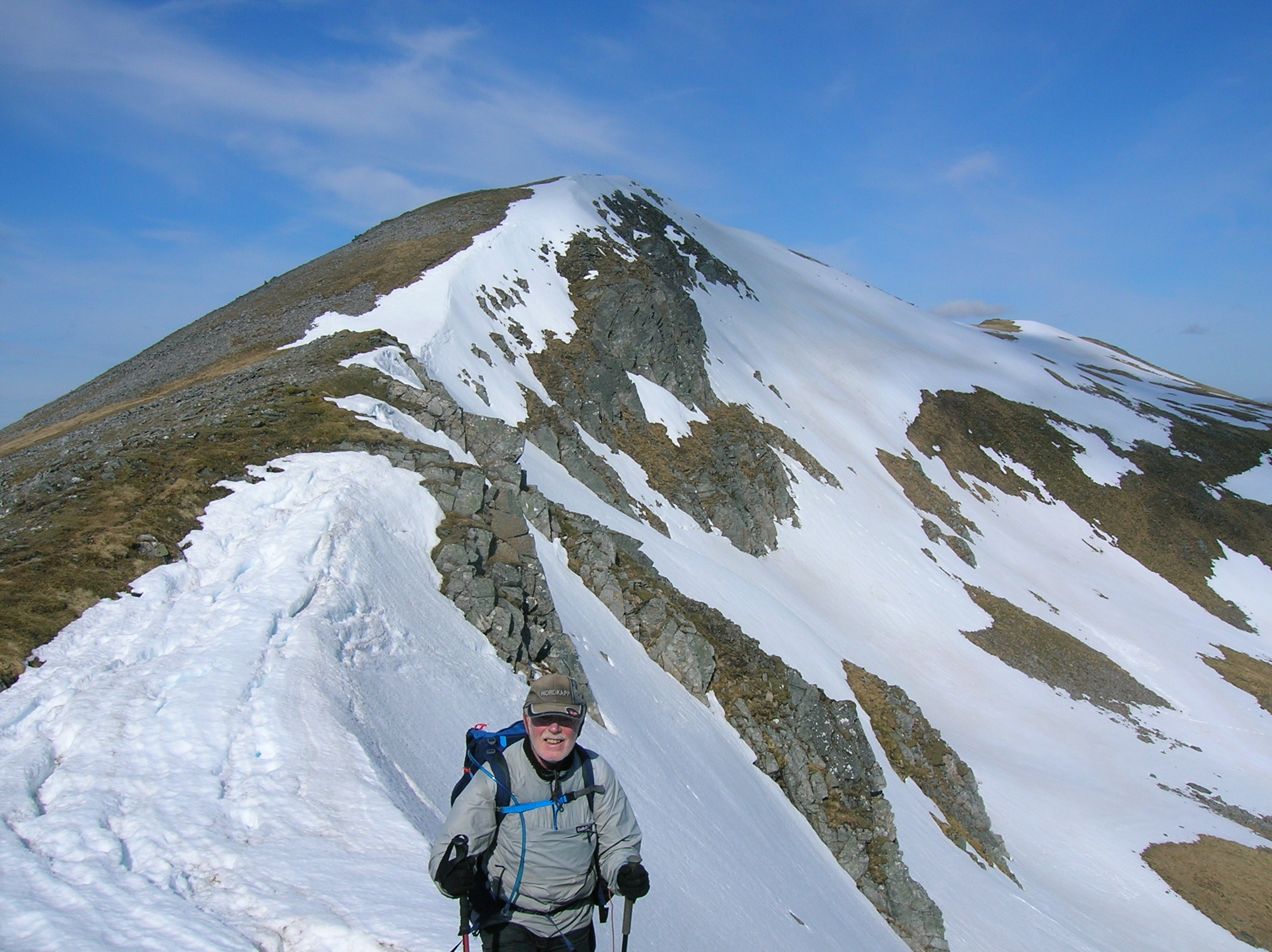 The north-east faces from here onwards were still holding sizeable snow cover. Mostly the ridge line was clear terra firma, but in several sections hard old snow up to a metre depth overlapped and called for attention.