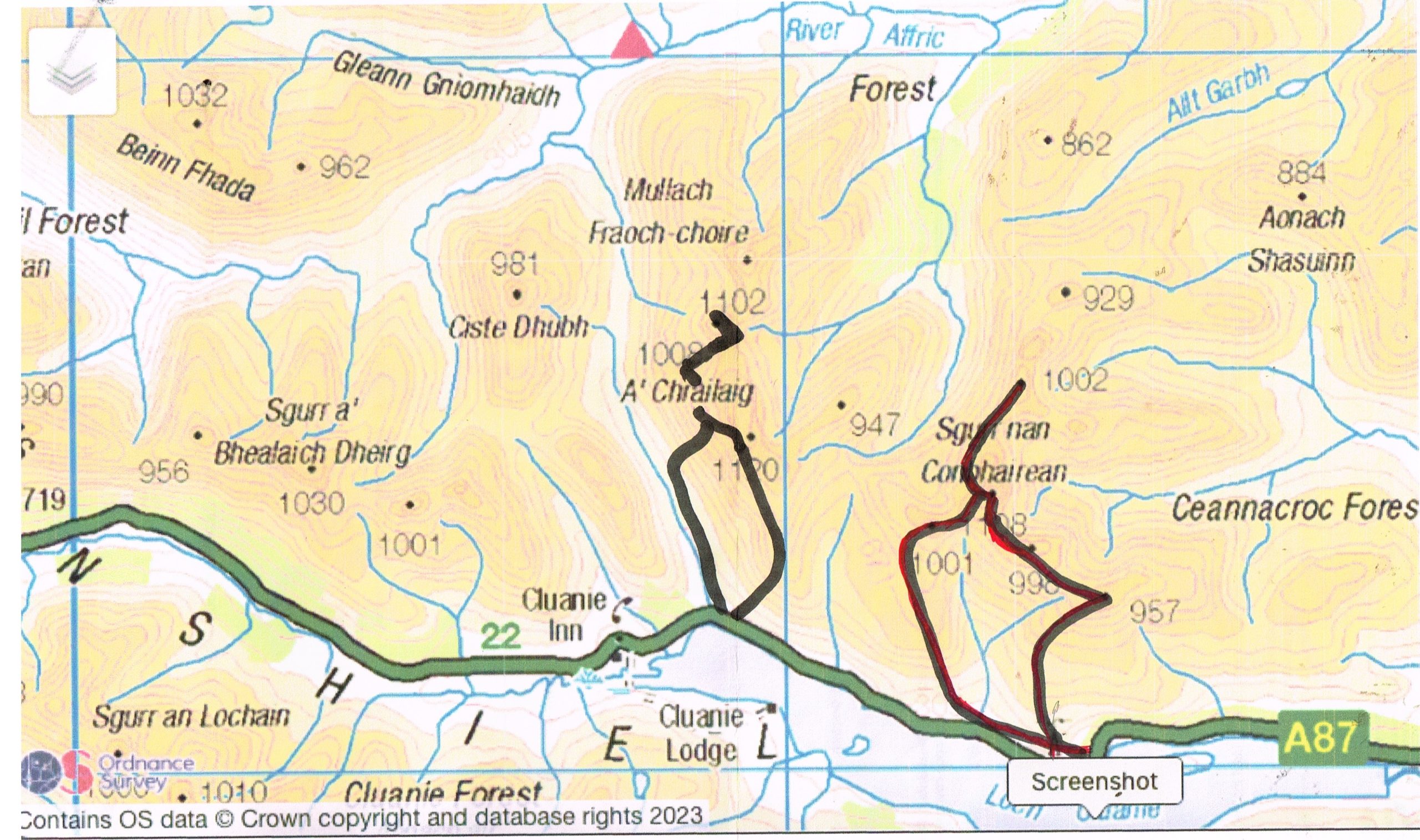 Looked OK, but almost ran out of road traversing a near-vertical rock face; the “path' less than 2 feet wide and the exposure pretty huge. Plus a couple of short clambers where a slip would be unthinkable. A long crack in the ground /sod indicated that this way will not exist too much longer. We returned same route. Carefully. Then once back past Stob Coire na Craileag we picked a way down the steep mountainside into the pass and south back to the road.
