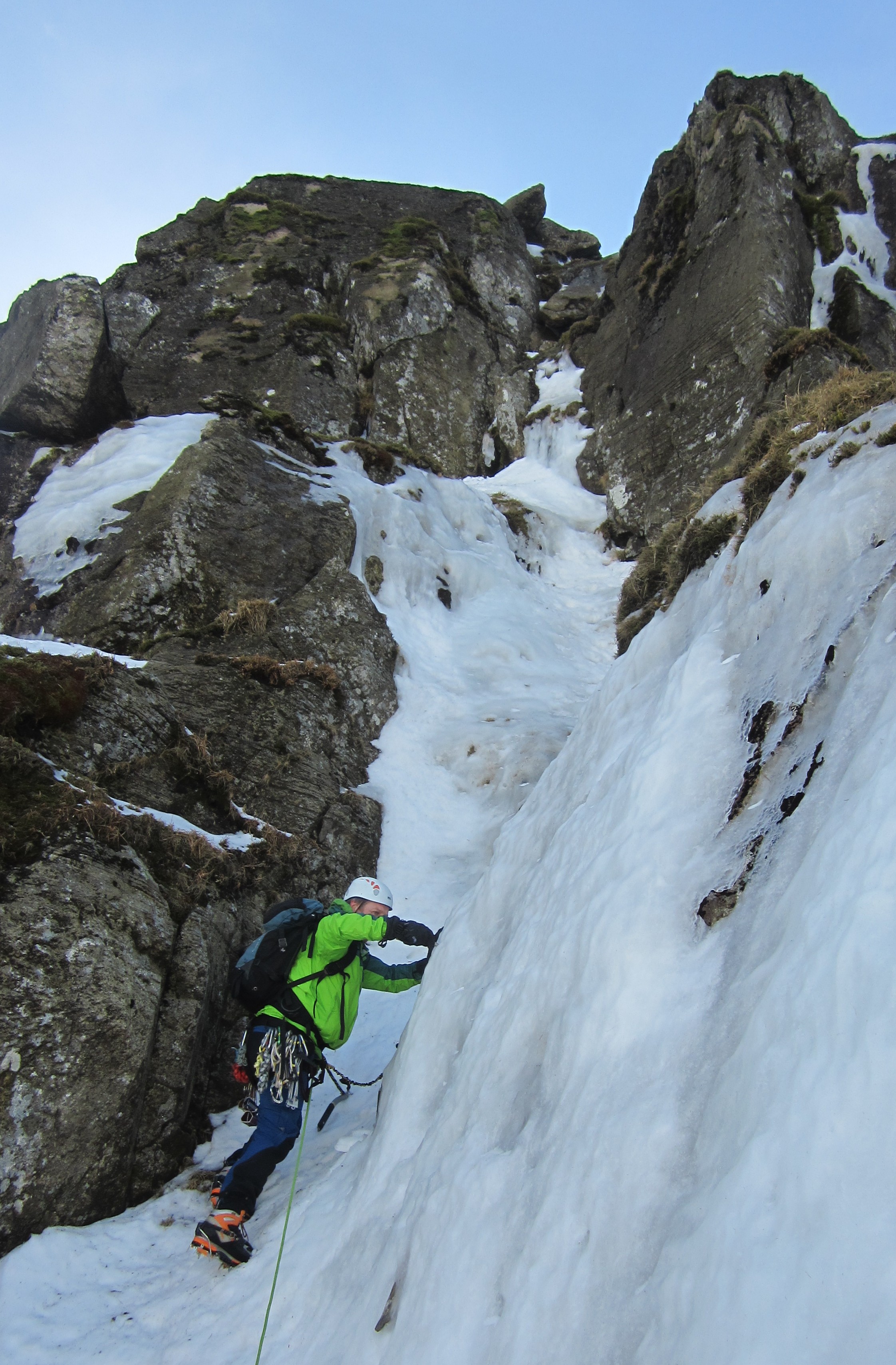 Matthew led the pitch.  His first Grade III lead and he rightfully gave it all deserved respect.  The thick ice was hard and capable of supporting ice screw runners and the exposed rock gave good opportunities for placement of conventional protection.  Progress slowed on the upper part of the pitch which had less ice and what remained was melting.  The frozen turf in this area was not bonded to the surface.  It was here where the M Diggle school of neolithic climbing technique came to the fore.  Unconsolidated turf, ice, snow and all manner of rude words were rattling around the crag for several minutes as Matthew attempted to gain a hold above a pointed  arête of granite.  When straddled above the arête, the thick ice slab under his right foot gave way and that too went cascading down the snow slope in a thousand tiny pieces.  Drama in itself, however, not nearly so dramatic as his instinctive and reflex action buttock clenching grip on the top of the arête which prevented any damage to his nuts, or the rest of his rack for that matter.   I would have taken a photograph but was working so hard to stifle my laughter that I probably would have dropped my camera.  I don’t know if Matthew saw the funny side of this unique climbing manoeuvre but it worked and after a few more rude words, flailing axes and careful bridging moves he made it over the crux.  Well done.