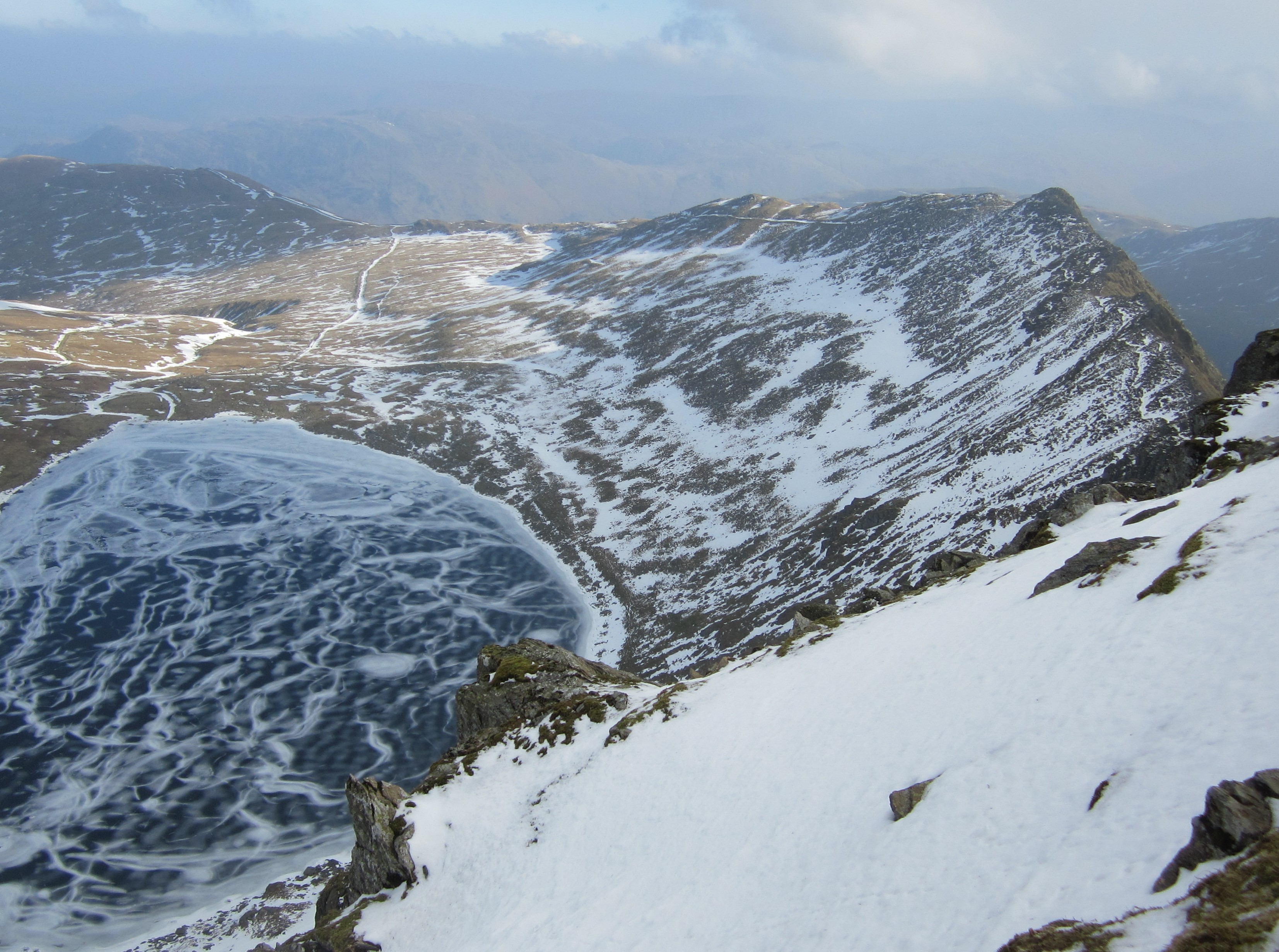 The weather was perfectly clear with only a slight south westerly breeze and during our steady progress up to Red Tarn only a few other pairs of climbers were seen.  Patches of hard, compressed snow and ice on the paths at the lower levels were melting and the temperature was notably mild.  However, as we gained height the snow became deeper but perfectly passable and consolidated with ice refrozen overnight.   Approaching Red Tarn we could see that the crag was still in reasonable condition with a decent amount of ice and snow remaining from the tarn up to the summit.  We moved anti-clockwise around the tarn to a small plateau immediately below the centre of the crag where we would gear up and make a final decision on which climb to attempt.