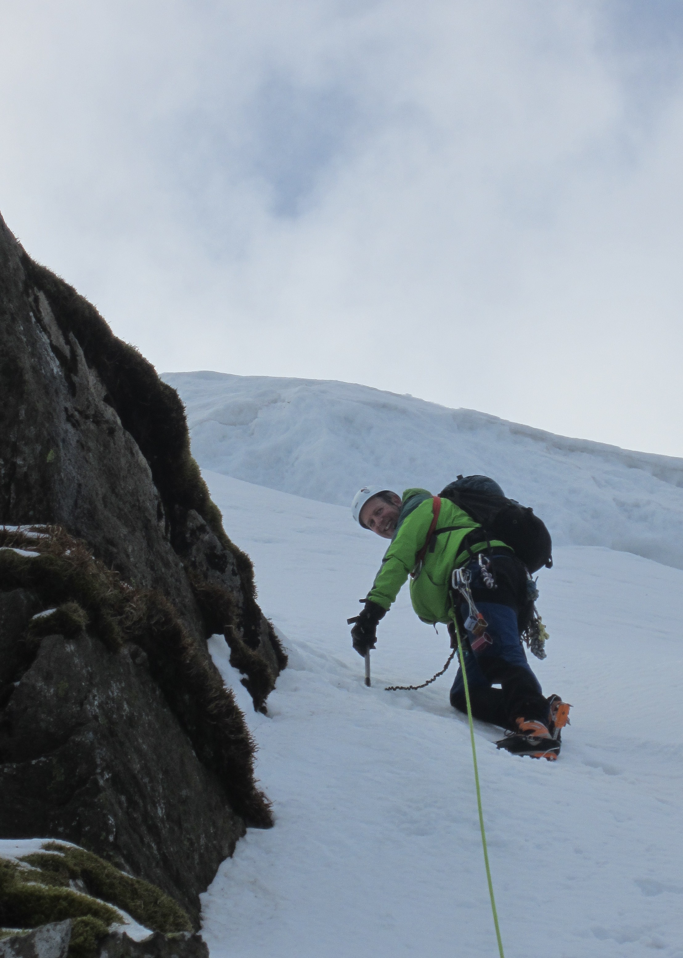 Matthew set up another solid belay just above this point and I climbed up without incident.  I noted my climbing partner's new ‘agricutural’ state of dress with his attire now accessorised with melting ice crystals, mud and freshly harvested turf (there are no protected fauna on this climb, but if there were, they could well be extinct by now).  I continued the climb up a straight forward 50m snow slope to another good, well protected belay point about 20m below the summit.  Matthew came up and continued over the top to the summit.  There was no cornice and it was a very simple finish to the climb after the exhilaration of the mixed ice pitch.