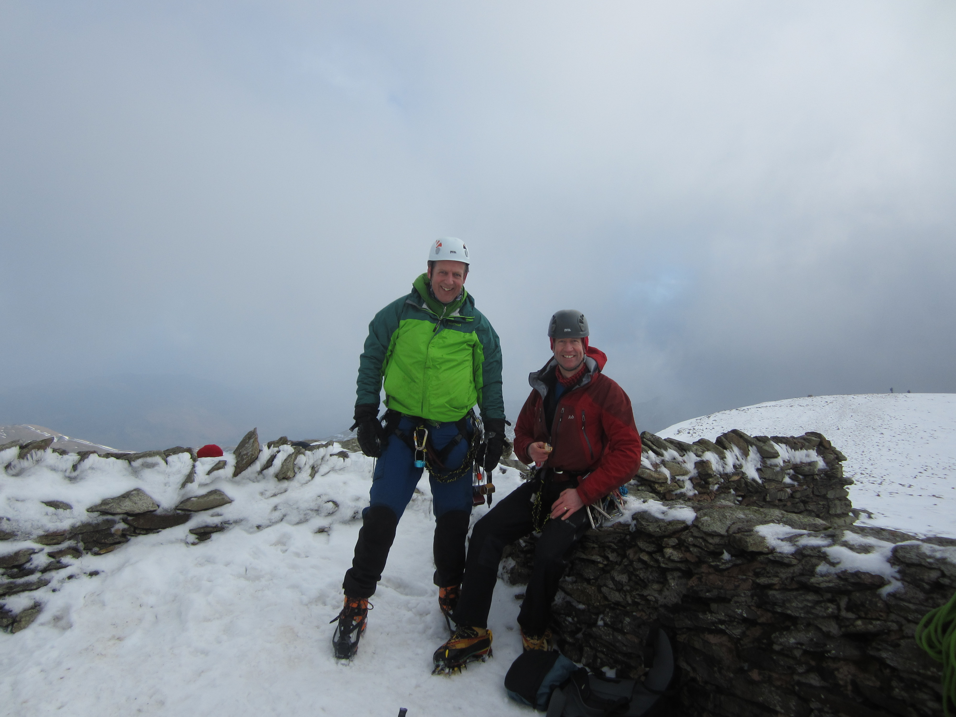 The time was now after 1300 and although the temperature continued to rise above freezing an expected weather front was approaching from the west and cloud was covering the summit.  The pair of climbers on V Corner met us at the top and told us that their climb was in good condition and well worth doing but we chose not to press on for another  climb, deciding instead to save it for another day.  Swrirral Edge was our descent route.  It was covered in snow but easily passable in the right gear.  A bloke in shorts and walking his dog was considering the route for his descent but we expect he picked a more appropriate way to get down.