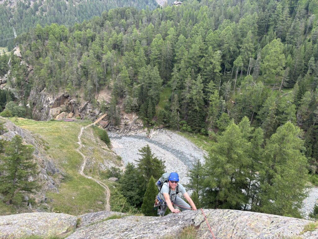 Arriving back down in the Valley in Saas Grund, still recovering from the price we paid for the Hohsaas gondola one way trip (£35 each!!), we decided, as this was a rest day, we would go sport climbing, so we checked out the local climbing garden, Feechi, about 15 mins walk from the Saas Grund. Feechi is a great spot next to a river with Grades ranging from 4a to 7++. We climbed a few of the lower grades as we didn’t want to ‘over-do-it’! The best route guide for Feechi was to be found on the UKC website!