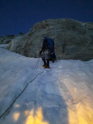 While heading to the ice ramp towards the Hohlaubgrat Ridge, we noticed the headlights of another group taking a slightly different line but heading for the same point, which if nothing else was reassuring on the navigation front. Soon we reached the foot of the ice ramp. The winter trips to Scotland had prepared us for this sort of terrain! The slope gradually increased in severity. Towards the end of this ramp Martin ran into trouble when, while front pointing the steeper end section, one of his crampons became detached from his boot. Luckily, he was able to grab it, while it was still hanging from his boot. There then followed an almost comical sequence of mountaineering skills fused with ballet moves before Martin could safely sit down and reattach the offending article to his boot.