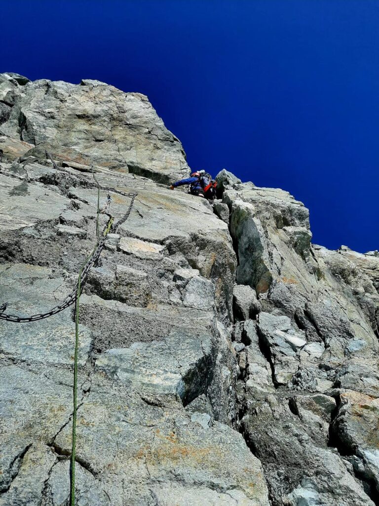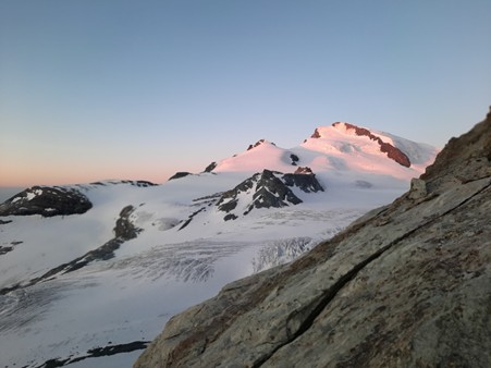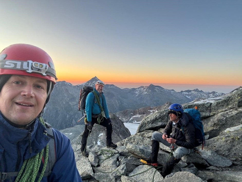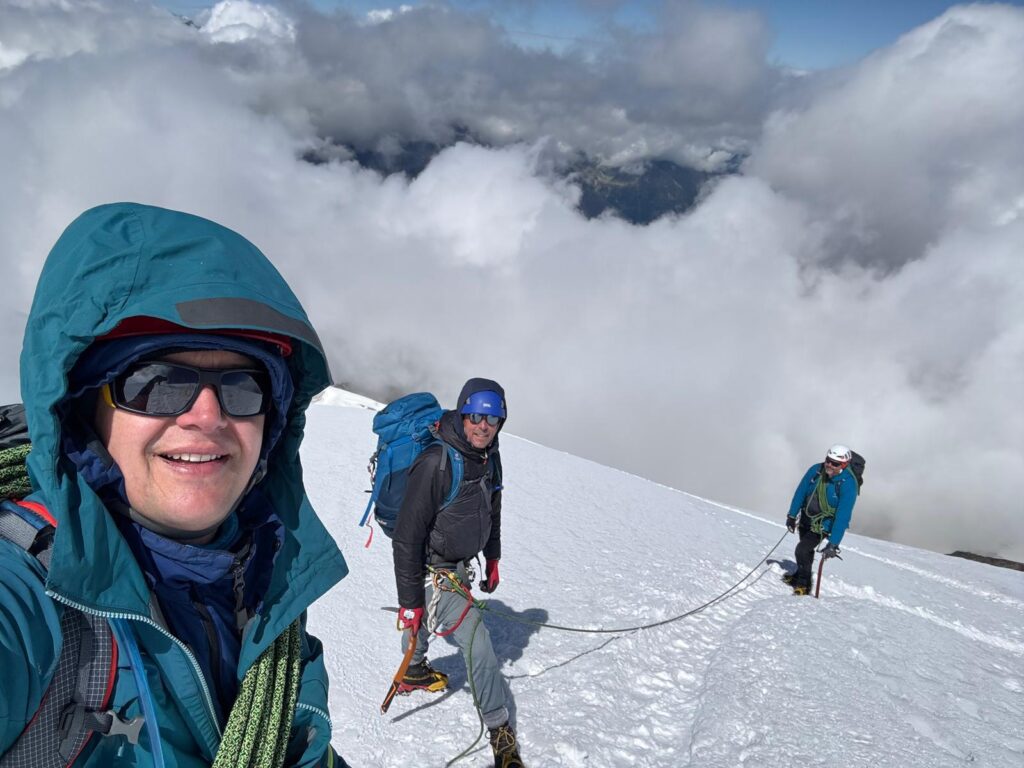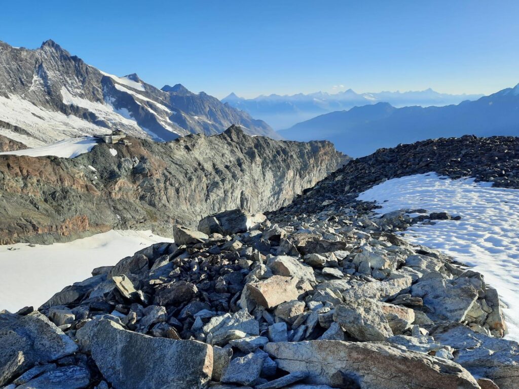 With rock underfoot the crampons were removed and while still roped together the team scrambled up the ridge. With elevation came views of the Strahlhorn and Rimpfischhorn, to the south, bathed in morning sunlight.