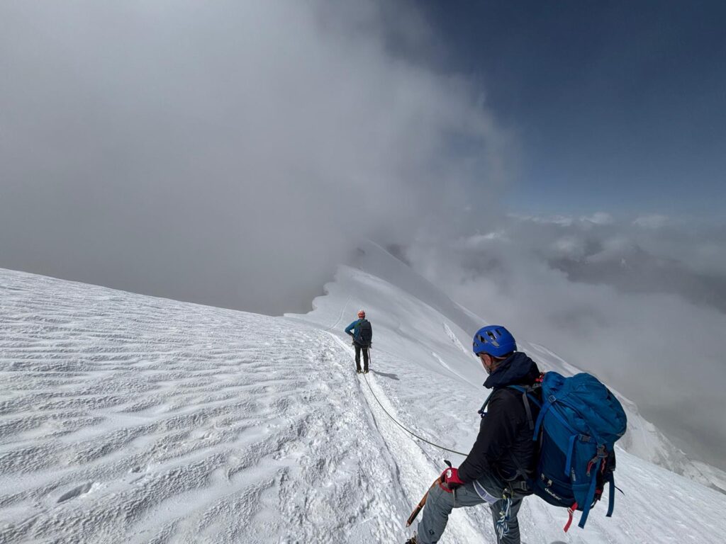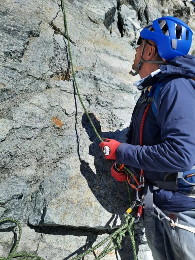 The team continued scrambling upwards in a classic roped alpine style to the ridge summit ~3597m before pausing to survey the route ahead.