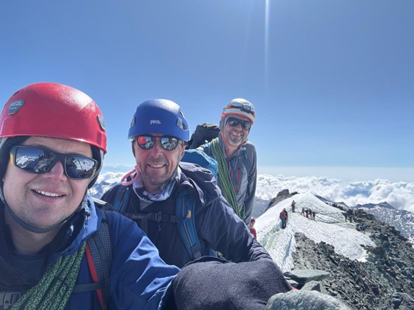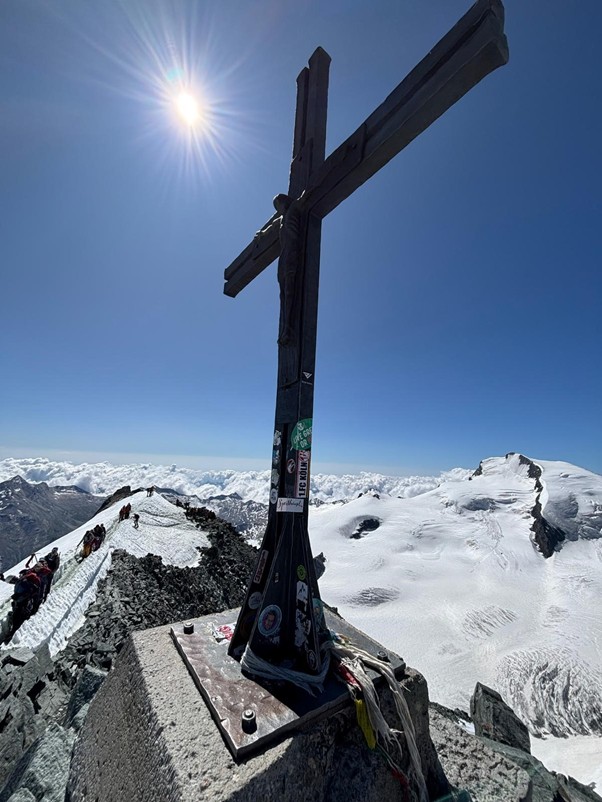 Further roped climbing / scrambling over very poor-quality friable rock led to the summit ridge and a spectacular view of the Matterhorn to the southwest. Once at the Allalinhorn summit cross (4027m) smiles, handshakes and congratulations abounded until we noticed a considerable queue had forming us. Primarily 'mountaineers' undertaking the normal route from Mittelallalin or as it was described to our team 'the walk of shame route', given its ease for a 4000m peak. The ascent had taken us about 6h 45m.