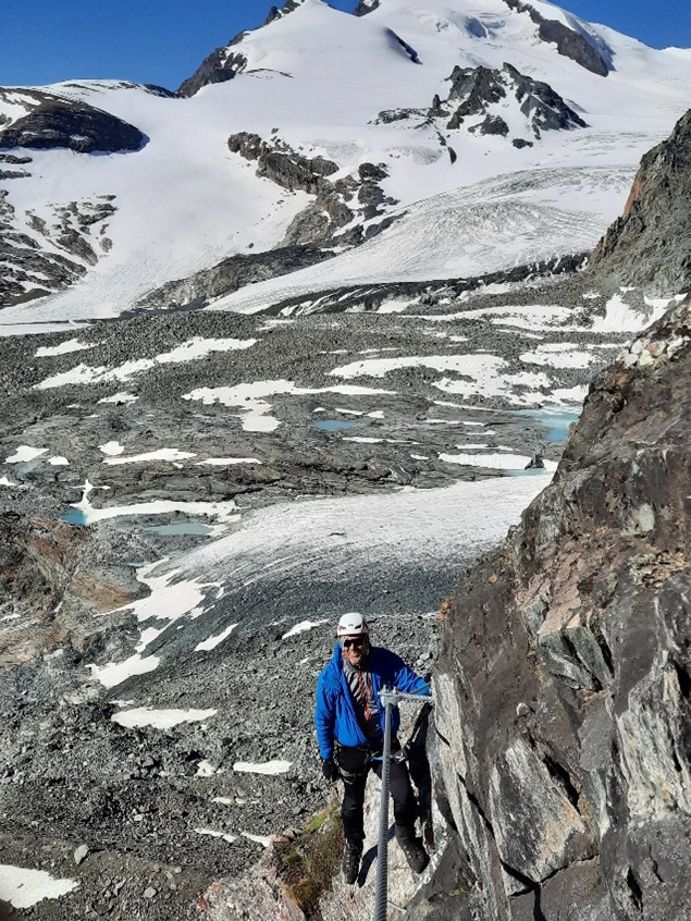 Martin and Ewart Brittania Klettersteig, Background; Stralhorn and the Hohlaugletscher. (Photo Derek)