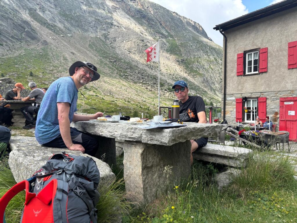 Early afternoon beverages at the AlmagellerHutte. (Photo: Derek)