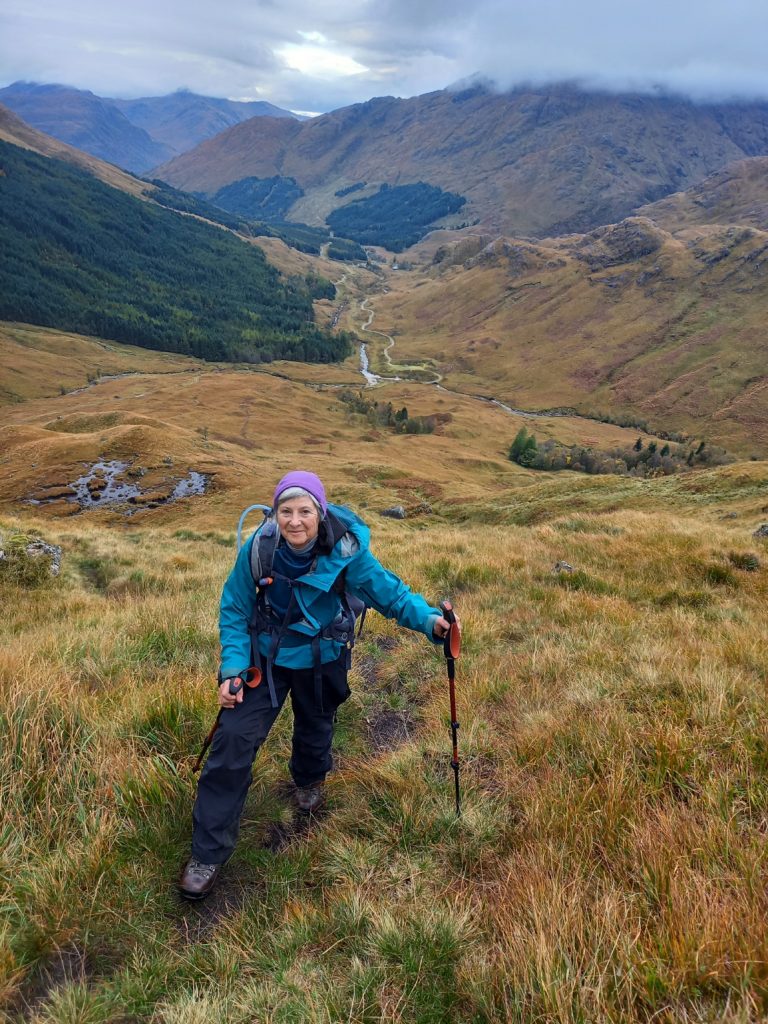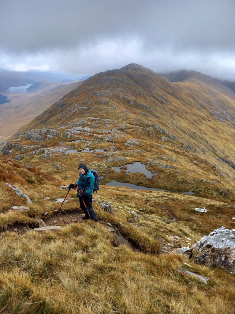 The descent had added interest due to the increasing and buffeting wind. The wind was now from our left as we made our way down the ridge to regain the main path just north of Corryhully bothy.