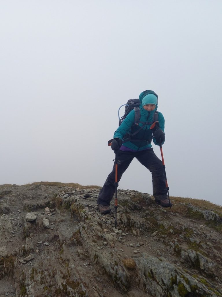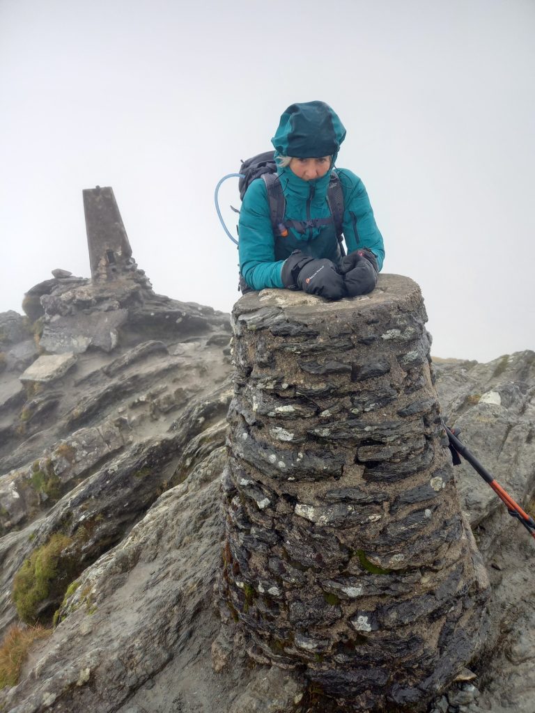 The first summit of Sgurr Thuilm was reached in good time but remained shrouded in cloud. Navigation was relatively straight-forward, following a line of fence posts. A brief rest and on towards the next summit via the connecting ridge to Sgurr nan Coireachan. The wind was from behind for this section, helping push us up and over the four minor summits enroute to the second Munro. The cloud base was above most of the ridge but stubbornly refused to rise above the highest tops.