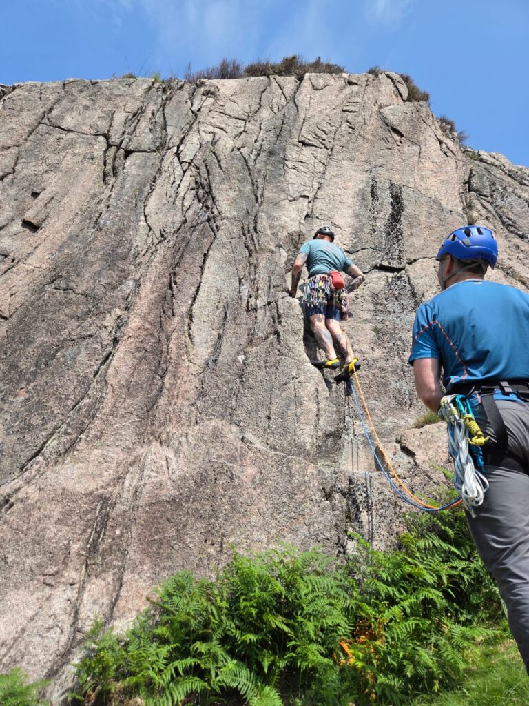 Dave M, Lee G and Stefan I were able to drive across on Friday morning and spent an afternoon in the hot sunshine at Hare Crags in Eskdale. Four single pitch routes were climbed including Pleasant Slab S 4a, Celebration VS 4b, Birthday Boy HVS 5a and Jugged Hare VS 4b. The crags were very easy to approach, all around 30m and generally slabby with good rock but lacking protection. An ideal situation to warm up before the main event on Saturday.