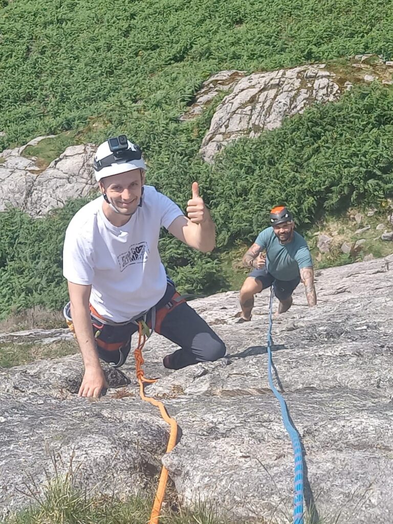 During their climb, Oli and Tracey were able to see how Dan S and Stefan were progressing on their climb which was just to their right. Dan and Stefan had been over-enthusiastic to their scramble up to the start for Slingsby's Chimney Route VDiff ** and had over-shot the pitch to the right which led to the chimney and the correct route. Tracey sent them a WhatsApp message to put them right.