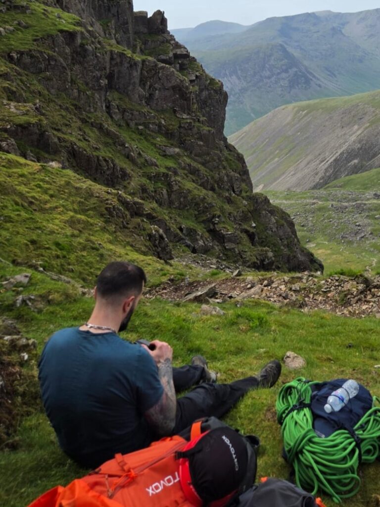 Lee and Dave M left the hut just after 6am for Tophet Wall HS 4b. The SAR helicopter and Wasdale MRT were already busy rescuing a casualty from the summit of Scafell Pike. The walk-in was already warm and it took almost two hours to reach the crag via Sty Head and the climbers' traverse.