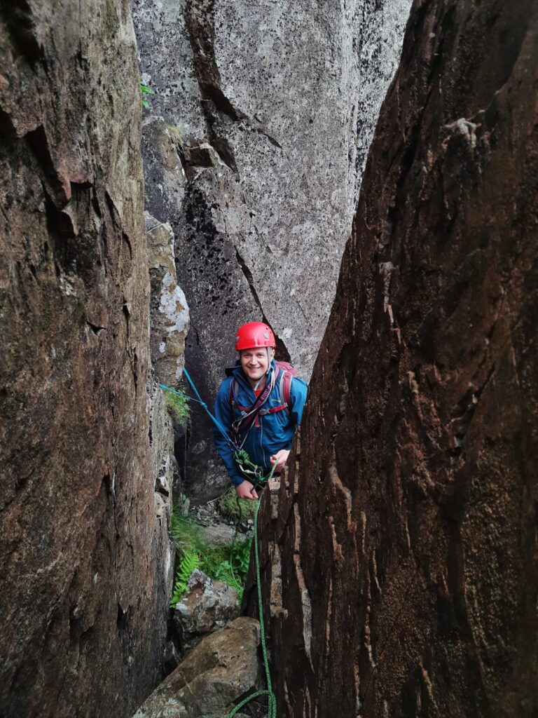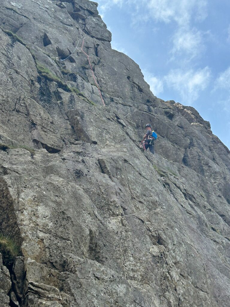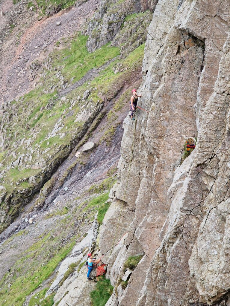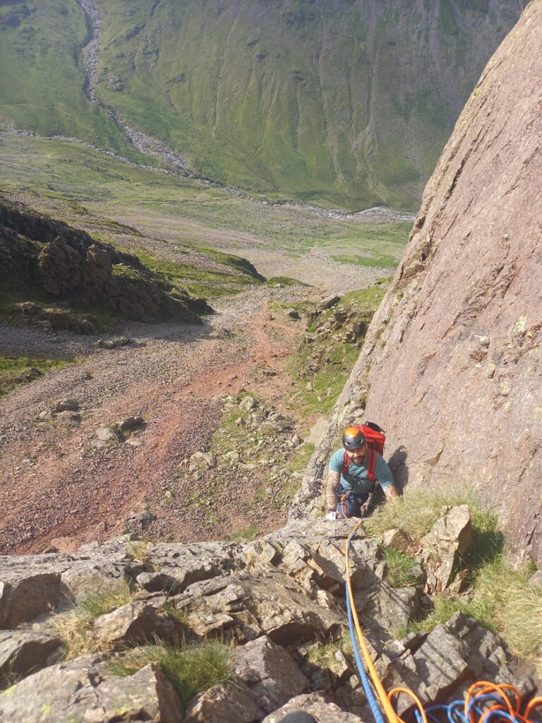 On the opposite side of Mickledore on Scafell Crag Jenny and Emma set their sights on Moss Ghyll Grooves. The VS 4c *** route proved to be a testing and rewarding climb. Testing the laws of physics, various items of equipment were dropped but thankfully all recovered by the end of the day. Testing the laws of navigation was the final element of the climb but Emma and Jenny made it safely back to Mickledore for the descent. Thanks Oli.